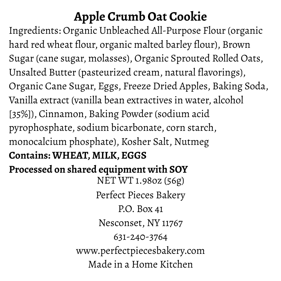 Apple crumb pie in a cookie: filled with apple pieces, cinnamon, nutmeg, and oats, with a crumb topping.